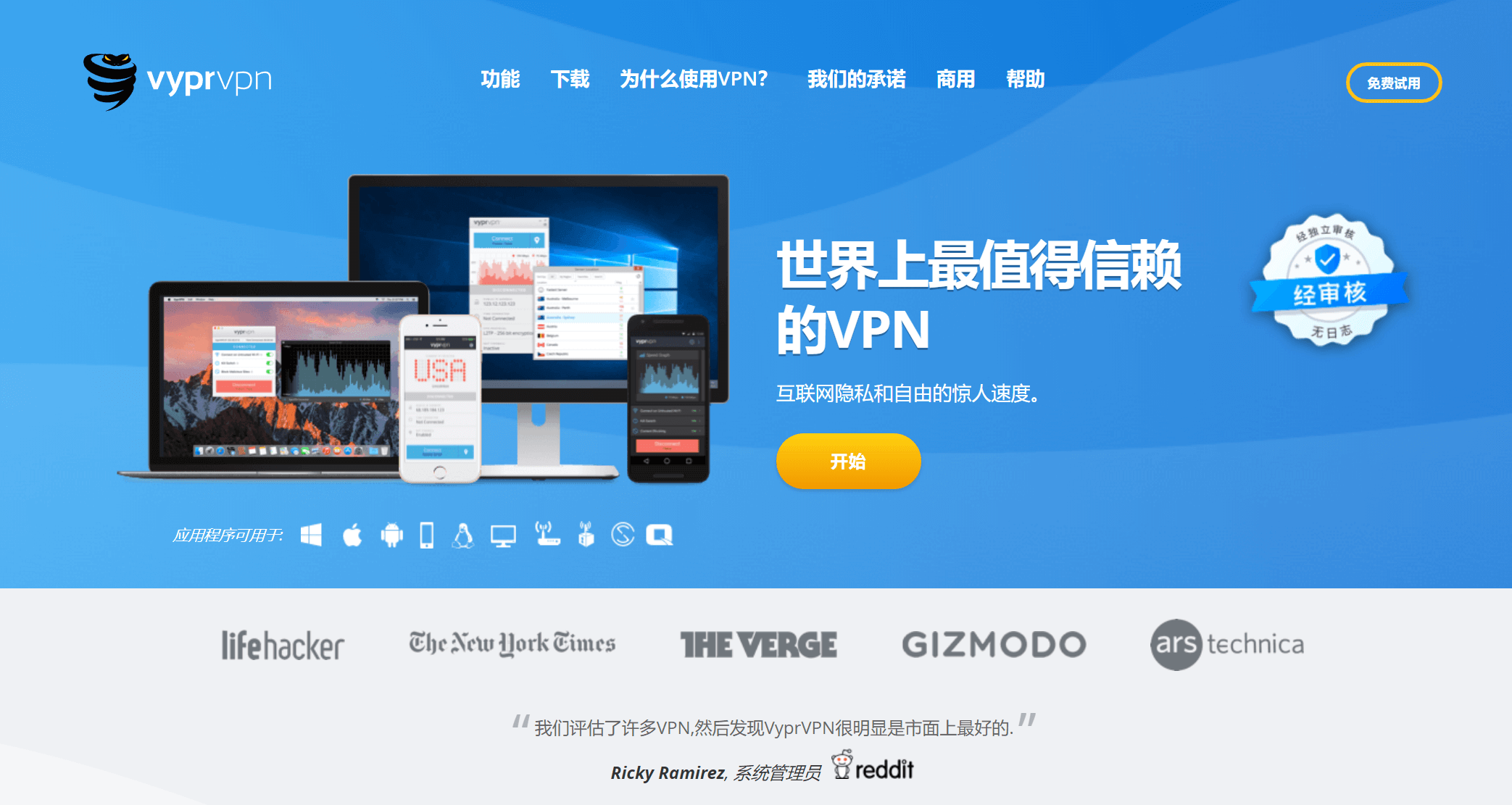 如果你主要是在手机等移动设备上使用VPN,那么VyprVPN会是最好的选择。VyprVPN的app简洁易用,支持中文,并且快速稳定。最低5美元/月,并提供3天免费试用,不过有500M试用流量限制。除此之外,他们使用Chameleon技术——用256位OpenVPN协议对数据进行加密,并能够轻易躲过防火墙的检测。VyprVPN在2019年推出了变色龙技术2.0,翻墙效果更好,目前除了iOS系统还要等待一段时间才能使用该技术外,安卓和Windows用户都可以使用。