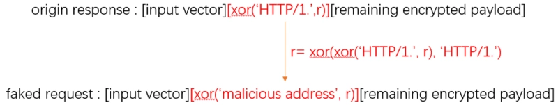 攻击的核心依据便是http的response包大部分情况下是以”HTTP/1.”为开头(可以通过伪造的包尝试建立连接来验证),那么当攻击者知道这一分片的明文与密文后便可以推算出与这一分片进行异或运算的密钥,但无法进一步逆推得到原始加密用的key来解密数据包中所有的信息。注意到response包的前7位,假如看成request包则恰好对应IPv4类型的7-byte target address,故攻击者利用得到的切片密钥与预设的恶意服务器地址异或运算,塞入数据包并作为request发送给ss-remote,便可以在服务器收到解密后的原始response数据。