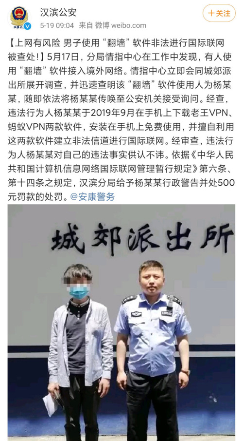 5月17日,分局情指中心在工作中发现,有人使用“翻墙”软件接入境外网络。情指中心立即会同城郊派出所展开调查,并迅速查明该“翻墙”软件使用人为杨某某,随即依法将杨某某传唤至公安机关接受询问。