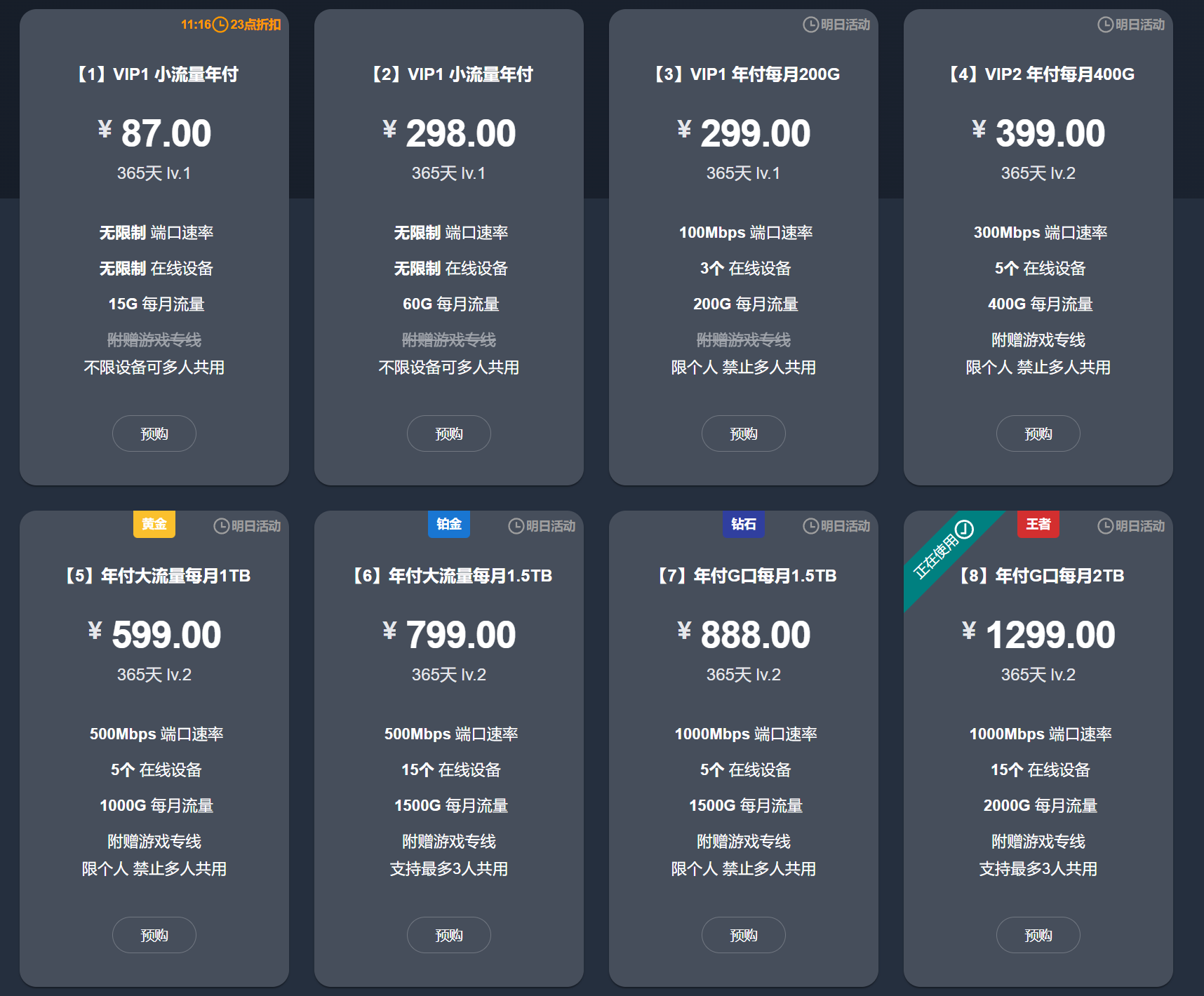 • VIP1 :¥87/年,15G流量/月,不限设备,不限速度。