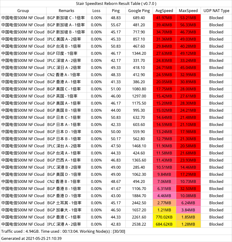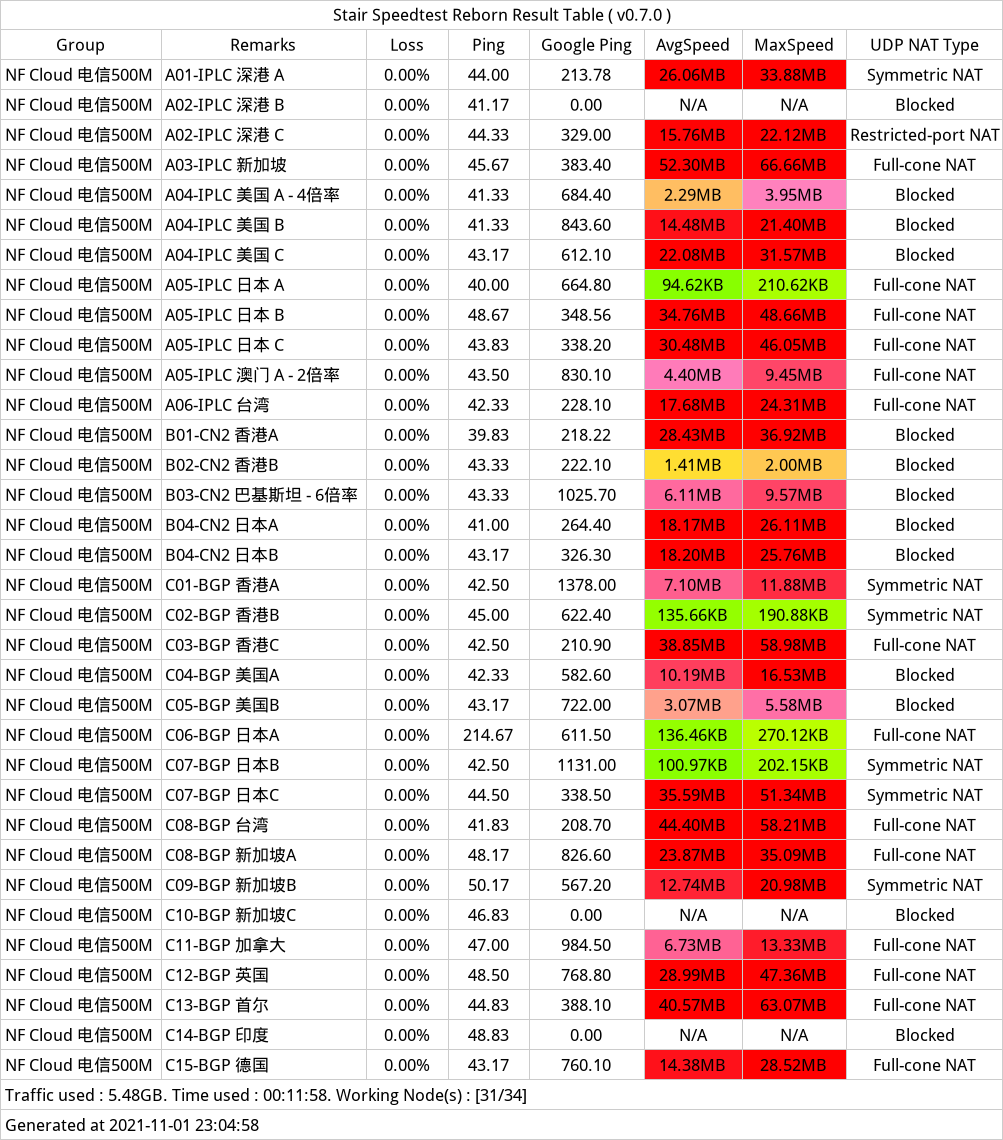 实际测速下来,NF Cloud 线路可用性还是蛮高的,但是最精品的两条IPLC深港专线居然挂了一条。经常会遇到过服务不可用状态,需要手动切换服务器节点。