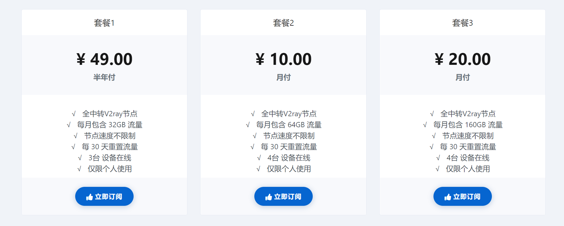 - 套餐1:¥49/半年,全专线节点,32G/月,不限速,最多3台设备在线。