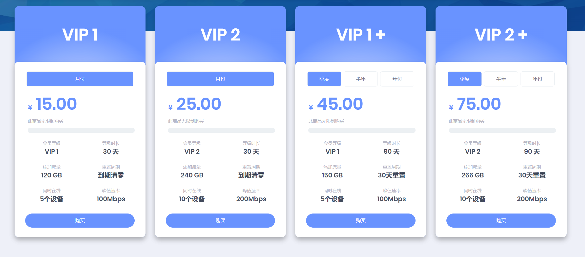 VIP2:月付 🈷️ 25¥ / 240 GB - VIP1+:季付 🈷️ 15¥ / 150 GB